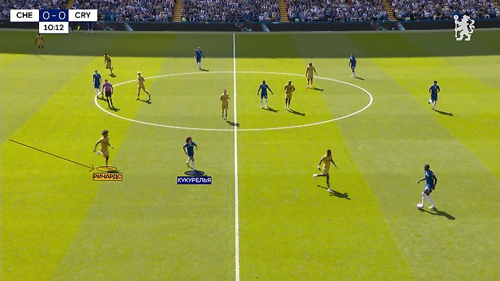 «Кристал Пэлас» оборонялся в среднем блоке по схеме 5-2-3. Тройка Эзе – Матета – Сарр старалась увести мяч подальше от своей половины поля за счет давления на тройку защитников «синих». У «орлов» получалось держать компактный средний блок с минимизацией пространства в центре поля.