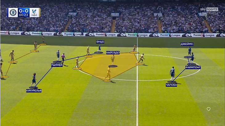 В моменте с обрезом Ачимпонга все сработало. Кукурелья накрыт Ричардсом, тройка спереди активно прессингует защиту, вынуждая Джоша быстрее принимать решение. Уортон остался вплотную с Кайседо, а Эзе находится в «полупозиции», контролируя передачу в коридор на Энцо, либо на Джеймса. Как раз первый вариант Ачимпонг и выберет, что приведет к перехвату мяча, и последующему опаснейшему штрафному.