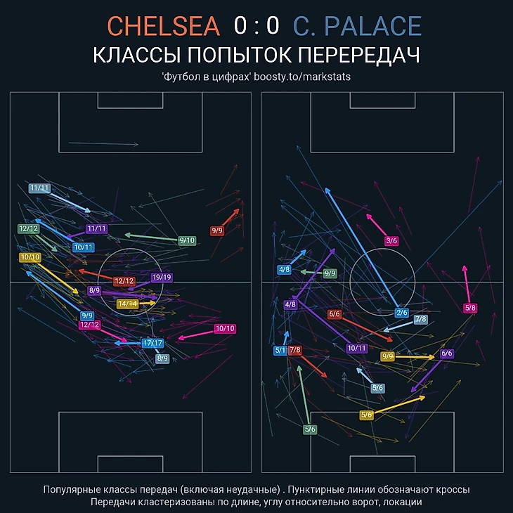 Посмотрите на классы передач «Челси». Большинство из них сделаны вдоль, почти без обострения. Я снова отдам должное команде Гласнера за работу в среднем блоке. Именно она и вынудила «синих» к бесконечным перекатам между защитниками.