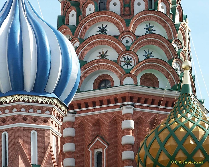 Что символично, храм Василия Блаженного окрашен в цвета «Спартака», «Локомотива», «Динамо», ЦСКА и «Торпедо»... А может, выбор клубных цветов и был осознанно или подсознательно продиктован именно этим собором? В первой половине XX века спортивные общества участвовали в физкультурных парадах на Красной площади, в то же время, в атеистическом государстве было не принято афишировать все, что так или иначе связано с религией. Церковь с красно-белой главой носит имя Николы Великорецкого - святого покровителя Николая Старостина, который считается автором спартаковского логотипа. Последний вполне мог разбираться в подобных нюансах, поскольку происходил из старообрядческой семьи. Впоследствии он подвергся репрессиям, но в итоге был оправдан; в свою очередь, Николай Чудотворец известен как защитник несправедливо осужденных. Под куполом горизонтальные ромбики, на которые мог быть наложен его орнамент, при этом первоначально белая полоска на эмблеме шла по другой диагонали. Также ромб использовался прародителем «Спартака» - Русским гимнастическим обществом, которое спонсировал Н. Н. Шустов. Его дед был служителем церкви Николы в Кошелях и назвал сына в честь Николая Чудотворца, а тот передал это имя собственному первенцу. Известно, что Шустовы арендовали помещения в торговых рядах на Красной площади.