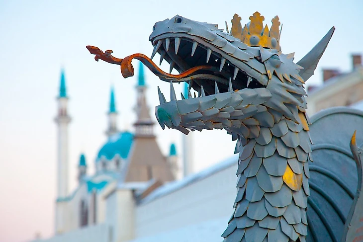 В указе XVII века змей Зилант, изображенный на казанском гербе, был назван василиском. Поскольку Казань является третьей столицей, он замыкает последовательность, которую образуют Васильевский остров в Петербурге и Васильевский спуск в Москве. Храм Василия Блаженного был построен по случаю взятия Казани, кроме того, мистик Алистер Кроули отмечал созвучность этого названия с василиском. В греческом языке соответствующий корень означает «царственный», что соотносится со столичным статусом. Прежняя эмблема «Рубина» похожа на адресные таблички, оформленные в ретро-эстетике. Дизайн Зиланта может быть связан с конфигурацией дорог между казанским Кремлем и стадионом; в таком случае, его шея - улица Баумана, тогда как крылья - Правобулачная и Левобулачная.