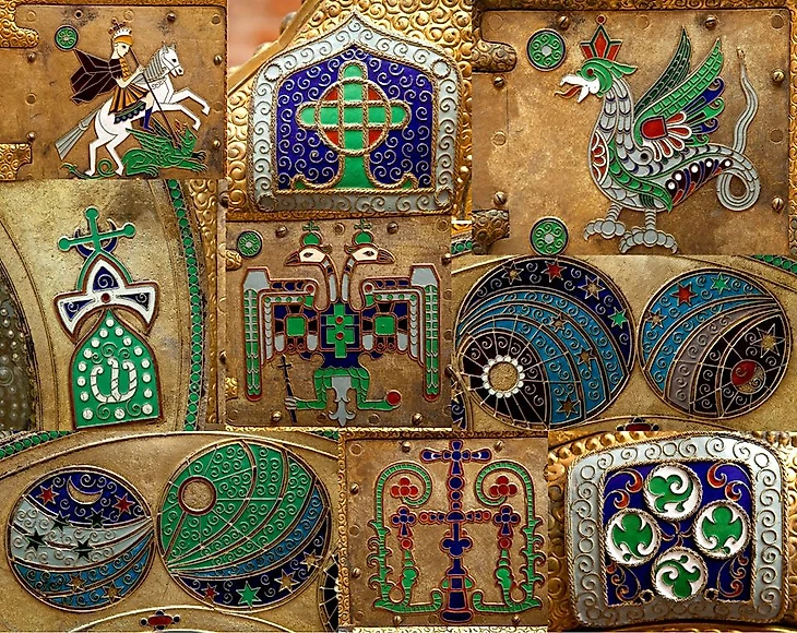 У Спаса на Крови в Петербурге аналогичное расположение планет-гигантов. Главный купол (Земля) включает четыре голубые полоски, соответствующие океанам. Зеленый цвет напоминает растительность, а белый - облачность, которые хорошо заметны при взгляде из космоса. Венера - вторая по величине планета земной группы, в свою очередь, близлежащий по отношению к Юпитеру позолоченный купол - Марс, вместе с Меркурием относящийся к типу так называемых миниземель.