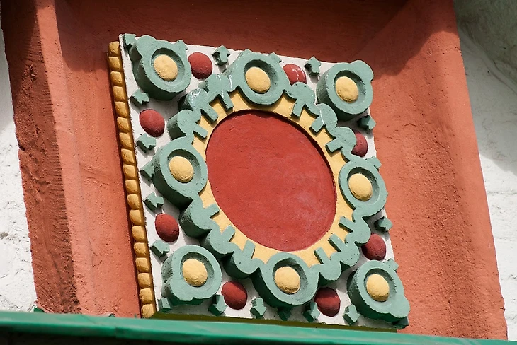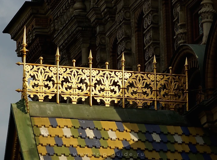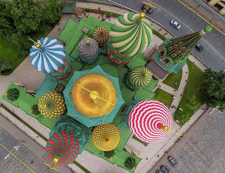 Шарики на шатрах напоминают пояс астероидов. Также они размещены на фасаде церкви, расположенной между крыльцами.
