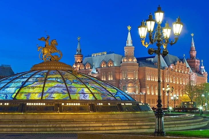 На Манежной площади, которая соседствует с Красной, расположен фонтан «Часы мира». Его купол имеет вид Северного полушария с 24 часовыми поясами и делает по одному обороту в сутки.