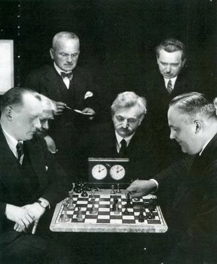 14-й матч за звание Чемпиона мира по шахматам А. Алехин - Е. Боголюбов, в центре арбитр – Э. Ласкер