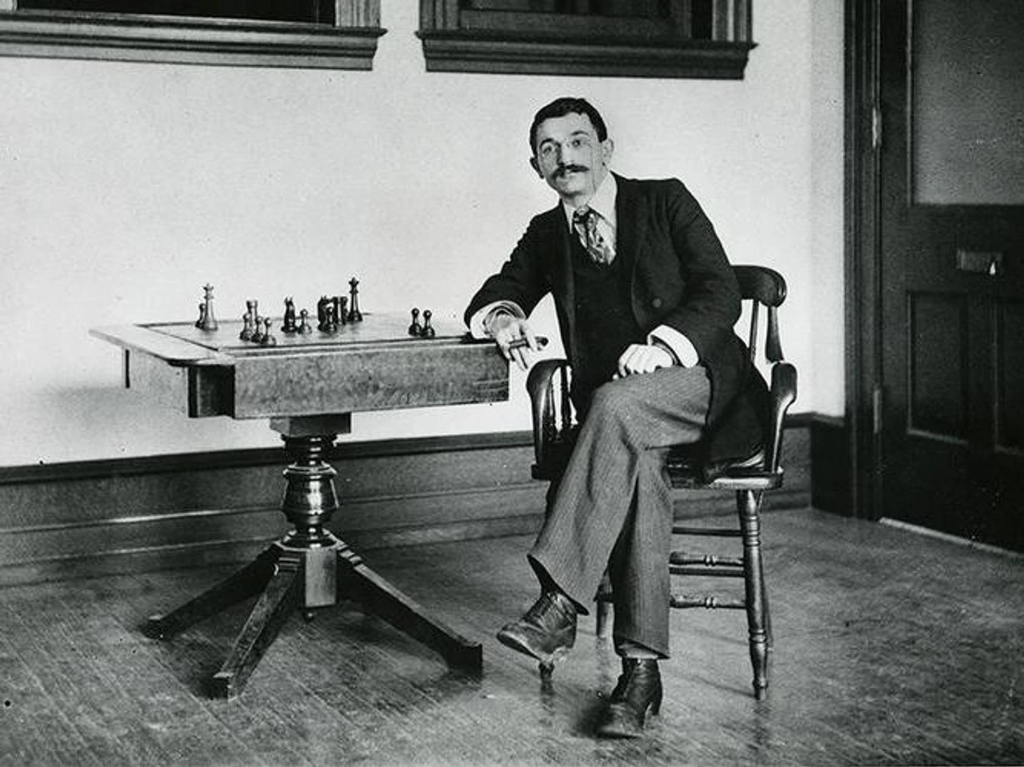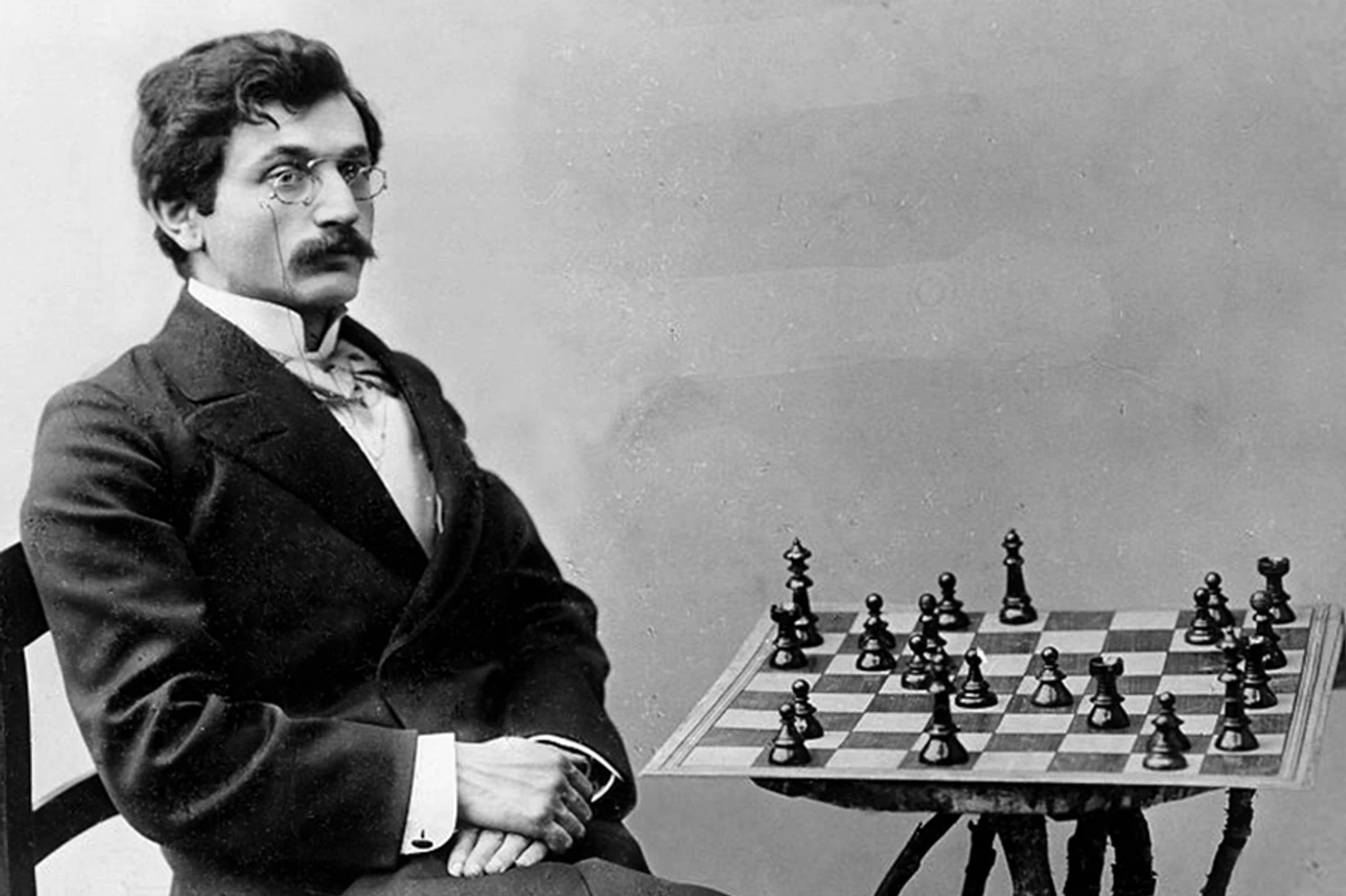 Когда мы вспоминаем о Ласкере, то в памяти всплывает трафаретный образ патлатого, бесформенного старика с ломанным носом и короткими усиками, неловко вполоборота сидящего к шахматному столику. Эмануил не торопясь чиркает спичкой, подносит ее к неизменной, торчащей из угла его рта, сигаре, делает длинную затяжку. А затем вся его маленькая ленивая фигура вдруг резко подается вперед, рука стремительно исполняет ход на доске, – и вновь вся замирает на месте, живыми остаются только его глаза.