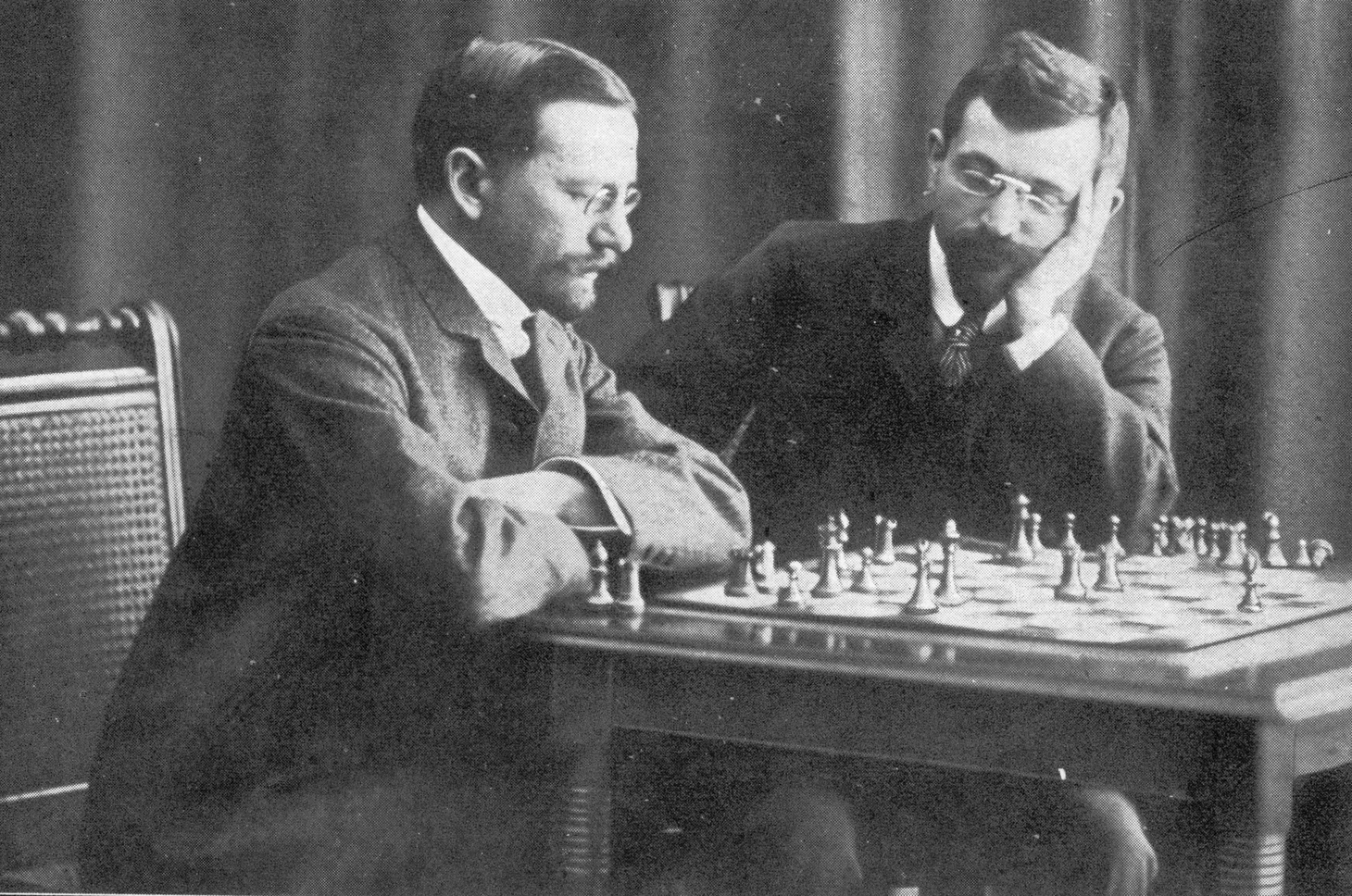 Победитель того турнира, американец Фрэнк Маршалл, сразу вызвал Ласкера на матч! И немец, понимая, что сейчас находится в неважной форме и ему нужно время, не стал повторять ошибки Стейница и давать немедленное согласие, – он сразу выдвинул такие финансовые условия, что Маршалл просто не мог бы их потянуть. На сбор денег у него ушло три года, и за это время много воды утекло. В общем, когда они сели за доску – в начале 1907 года, – это были уже совсем не те соперники, что играли в 1904-м. Эмануил выиграл восемь партий, не проиграв ни разу. Это случилось, не потому, что Фрэнк вдруг стал так плох – просто Ласкер крайне эффективно играл на его органических слабостях, не дав разгуляться богатой фантазии – на него точно вылили ушат холодной воды.