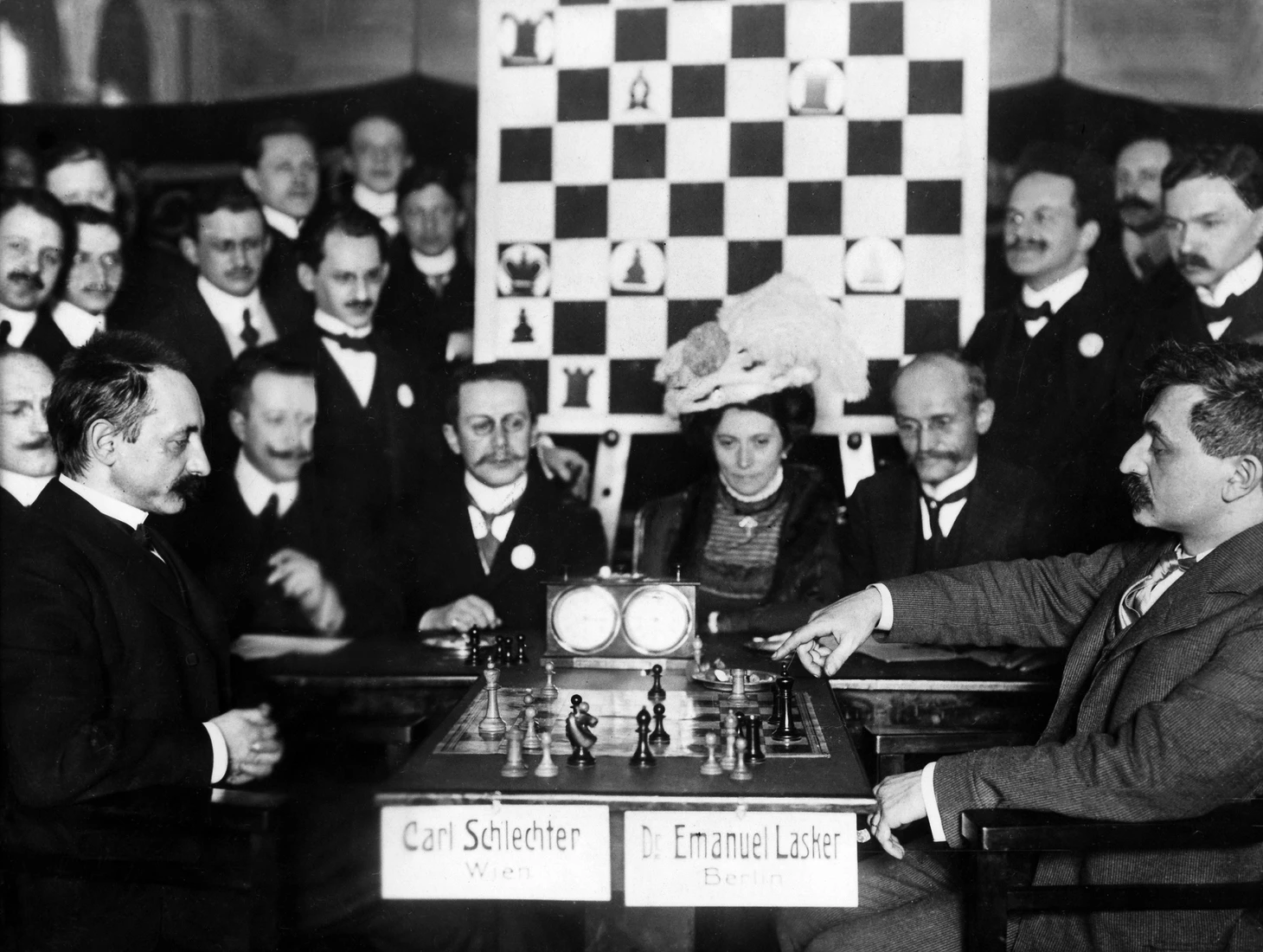 Самой серьезной угрозой для чемпионского титула Ласкера стал его матч против Карла Шлехтера. Бедный австриец, к 1910 году достигший пика своей силы, сумел найти денег только на 10-матчевый поединок (при том, что изначально предполагалось 30 партий), и еще на «кабальных» условиях – он считался бы победителем только в случае перевеса в два очка. Так что… когда при счете 5:4 в свою пользу, он в заключительной партии вдруг резко заиграл на победу, у него были для того веские основания. Иной вопрос – почему Ласкер, до того легко расправлявшийся со всеми, не смог раскусить Шлехтера?