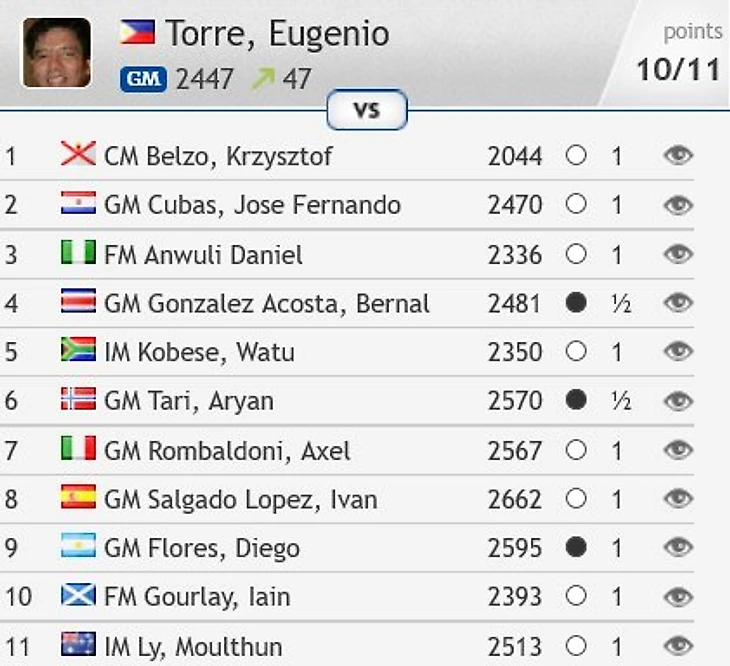 15:52 А тем временем Эугенио Торре сегодня победил и набрал 10 из 11 очков! Абсолютно фантастический результат! 64-летний гроссмейстер дал жару.