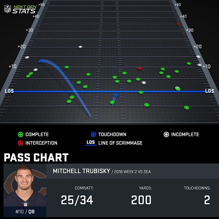 — Результат Трубиски 23 комплита из 26 бросков на 173 ярда, когда мяч был брошен менее чем на 10 ярдов.