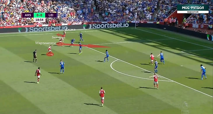 Через пару секунд Джака открывается во фланге, Мартинелли в роли восьмёрки, а Зинченко открывается за спину обороны: