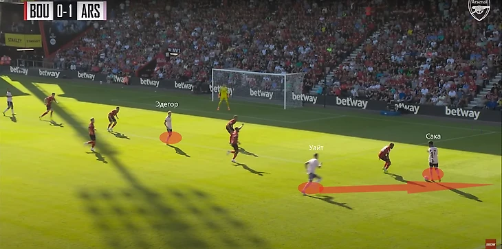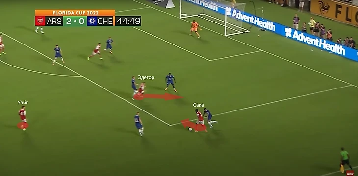 Сака с мячом, Эдегор открывается за спину. Если не получит мяч, то уводит игрока, открывая зону для Сака. Уайт располагается ближе к опорной зоне. У Букайо есть множество вариантов действий: