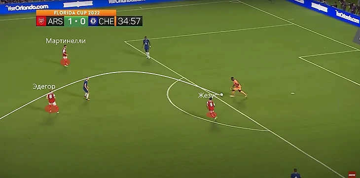 Эдегор не открывается за спину, а остаётся в штрафной, так как не видит потребность в помощи для Сака. Букайо в изоляции, может идти в обыгрыш, а Уайт располагается чуть ниже: