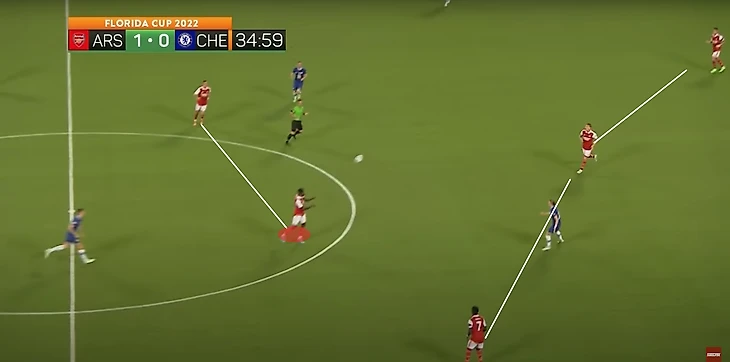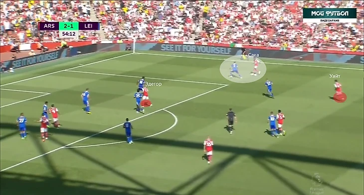 Сака с мячом. Уайт видит возможность создания численного преимущества 2 в 1 и делает забегание в помощь Сака. Эдегор остаётся внутри штрафной: