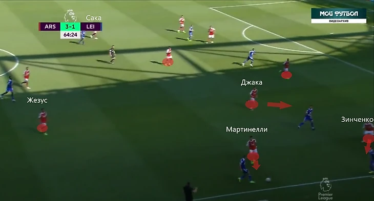 Зинченко может заходить в центр, оставляя фланг под изоляцию Мартинелли, а Джака открываться за спину обороны по полуфлангу;