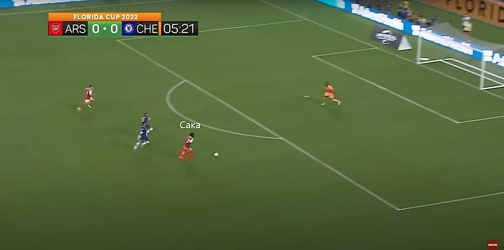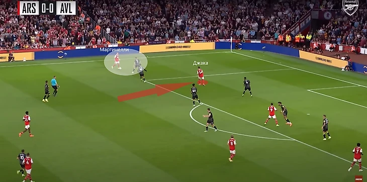 Мартнелли во фланге с мячом и для него есть условия для обыгрыша, но Джака открывается в полуфланге и получает мяч. Тирни, который заменял травмированного Александра, располагается ниже зоны мяча: