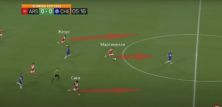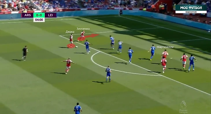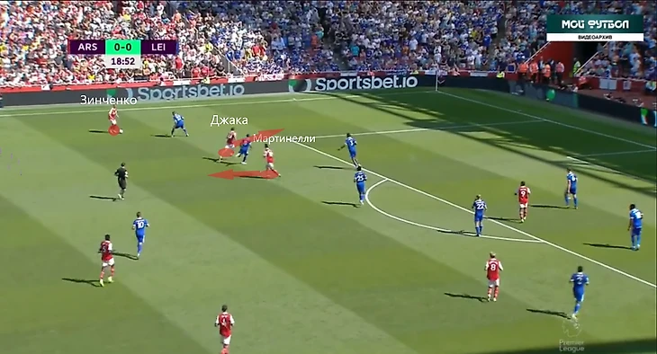 Мартинелли располагается в штрафной и, по сути, становится нападающим, а Джака и Зинченко взаимодействуют в полуфланге: