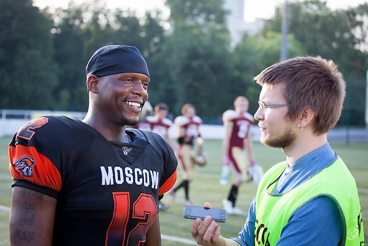 Обратная сторона Рынкевича – работа на матче по американскому футболу. В кадре легионер московских «Патриотов» Талиб Уайс.