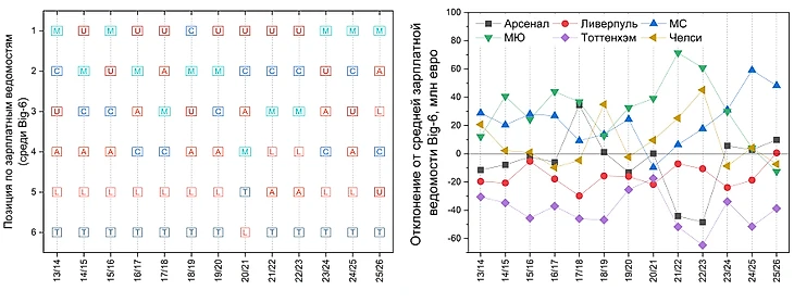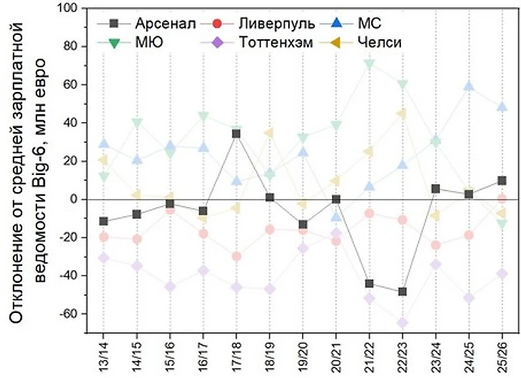 Также интересно, что МЮ, кроме огромных затрат на трансферы ещё и кучу денег сжёг на зарплаты. Арсенал всё время находится где-то в середине (кроме сезона 17/18 с большими зарплатами Санчеса и Озила), а МС и Челси в среднем на 2-3 месте, что говорит о грамотной политике по зарплатам в этих клубах вплоть до контракта Холанда.
