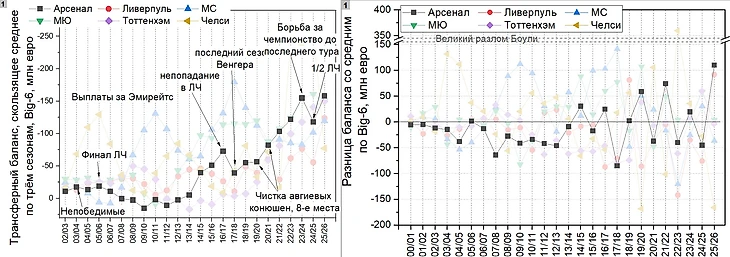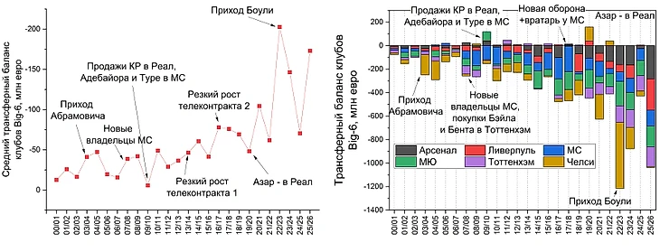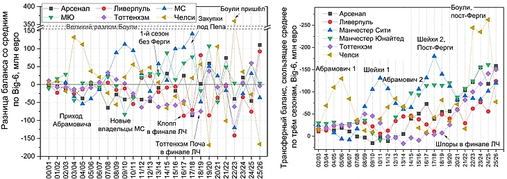 Можно выделить несколько знаковых точек: приход Абрамовича и новых владельцев (не только шейхов) в МС в нулевые, рост среднего отрицательного баланса после повышения телеконтрактов с сезона 13/14, закупки эпохи Гвардиолы, приход Боули в Челси и, наконец, выдающееся летнее окно текущего сезона, где выделились все клубы Биг-6, кроме Челси.