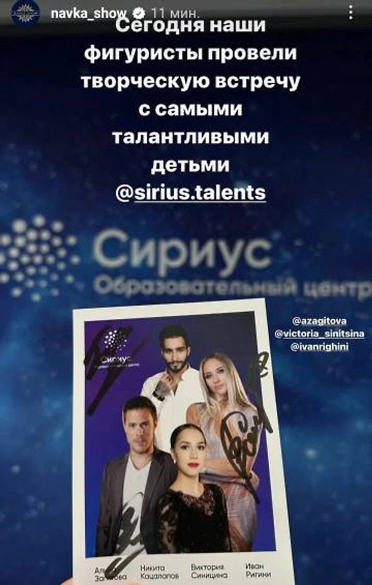 Пребывание Алины в Сочи не ограничивается только выступлениями в шоу. Также, на днях, Алина Загитова вместе со своими коллегами по льду, Викторией Синициной и Иваном Ригини, посетила творческую встречу с талантливыми детьми образовательного центра Сириус @sirius.talents