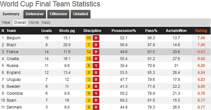 Лучший рейтинг у бельгийцев, у них же и большее число забитых мячей-16. Это говорит о том, что в другой сетке они бы боролись за первое место. Ну и плюс соперники, с которыми сталкивалась сборная Бельгии не были слабыми. Те же японцы, вынесли бы англичан вперед ногами. Сборная Бразилии на втором месте, так высоко её поднял Неймар, который даже попал в сборную турнира. Французы на 3м месте, хорваты на 4м. И это говорит о том, что сборная Хорватии заслуженно заняла своё место. Сборная России больше всех боролась,меньше всех в топ-10 владела мячом, но забила целых 11 мячей. Шли-то хорошо.