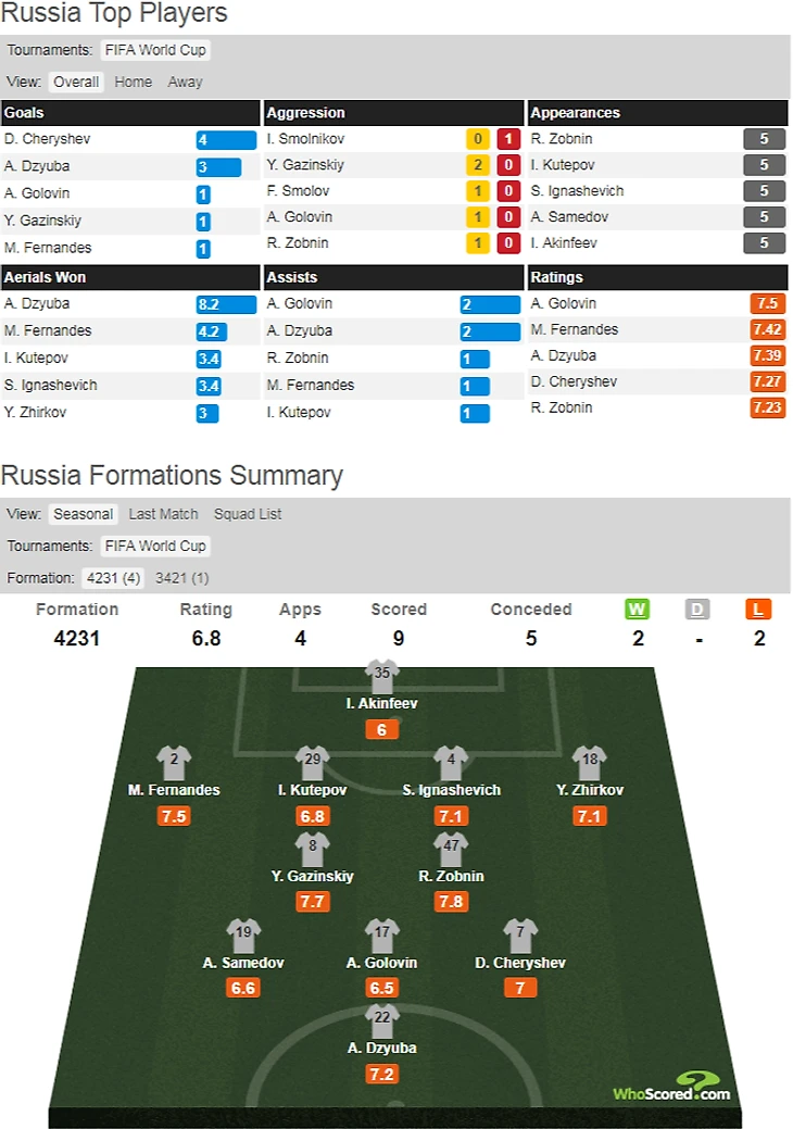 Согласно данным сайта whoscored, лучшим игроком нашей команды стал Александр Головин, который шикарно провел первые два матча и много совершал черновой работы в других матчах. Все время на поле провели Акинфеев, Кутепов, Зобнин и Игнашевич. Зобнин был крайне полезен на поле и это после травмы крестов год назад. Ну и нельзя не отметить то,как рядом с опытным Игнашевичем прибавил Кутепов.