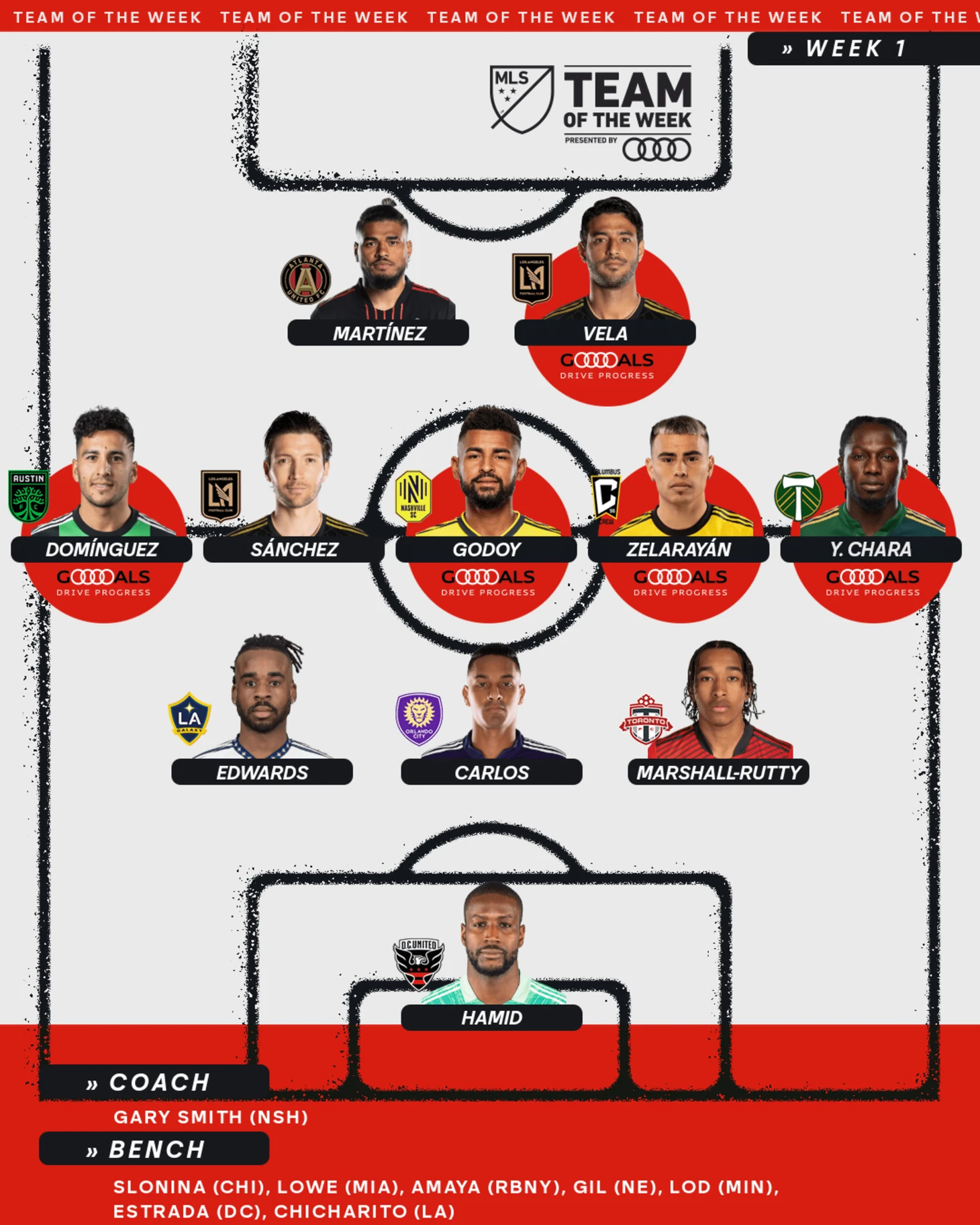 Габриэль Слонина(Chicago Fire), Дамион Лоу(Inter Miami), Фрэнки Амайя(New York Red Bulls), Карлес Хиль(New England Revolution), Робин Лод(Minnesota United), Микаэль Эстрада(DC United), Чичарито(LA Galaxy).