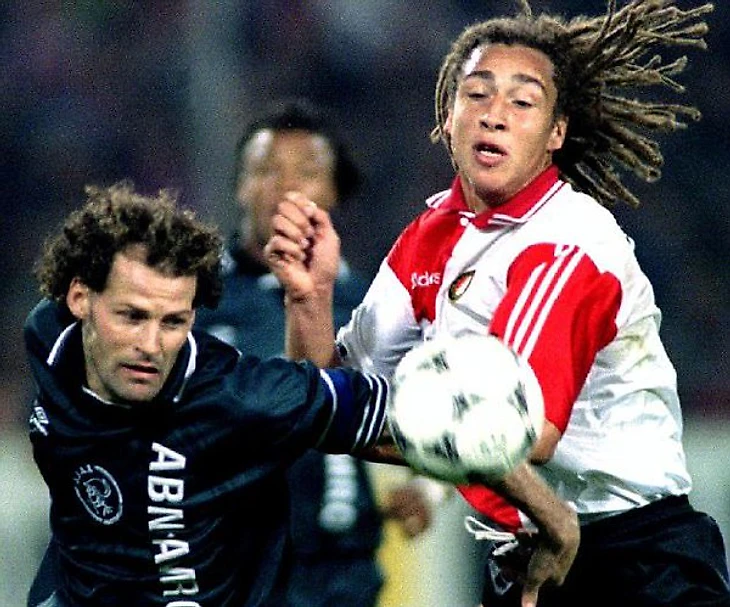 Сейчас к голландскому чемпионату принято относиться снисходительно. А тут смотрите, как рубятся четкие Данни Блинд и Хенрик Ларссон, а на заднем плане на это смотрит мутный Эдгар Давидс.