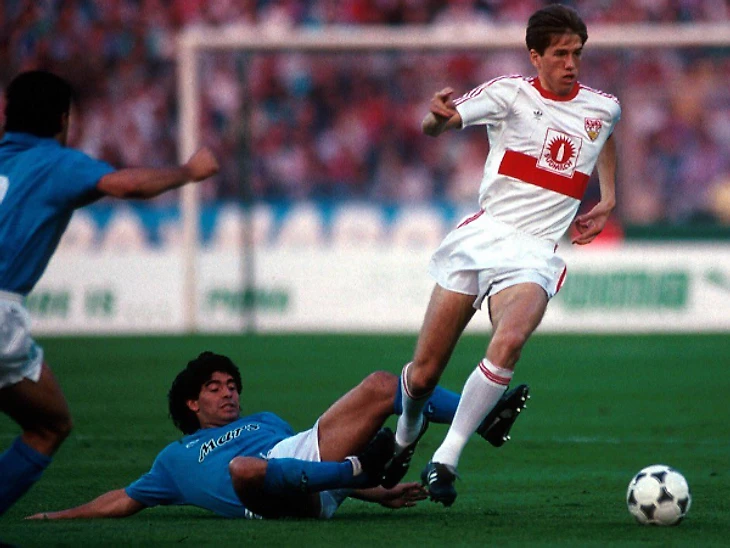 Необычная картина в финале Кубка УЕФА-1989. Диего Марадона стелется в подкате против опорника «Штутгарта» Сречко Катанеца.