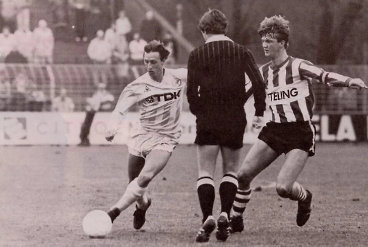 Судья мешает Луи ван Галу справиться с прорывом Йохана Кройффа.