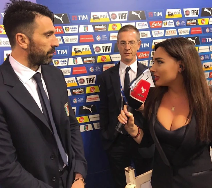 30-летняя ведущая Илда Бежлери взяла интервью у Джанлуиджи Буффона для албанского спортивного медиа DigitAlb после матча Италия – Албания (2:0). Фото оказалось в твиттере Марко Трабукки, а затем – почти на всех экранах читателей Sports.ru. На фото вратарь, сыгравший 1000-й матч в профессиональной карьере, героически держится, чтобы не уронить взгляд на грудь Илды.