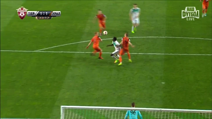 33-я минута. Мбенг, находясь возле двух центральных защитников Динги и Панкова, принимает мяч, разворачивается и мощно бьет в левый от себя угол – 1:1.