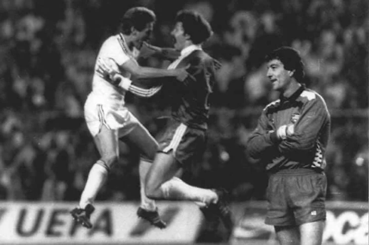 Один из самых насыщенных кадров в истории футбола. Вратарь «Барселоны» Уррути саркастически улыбается. Только что его коллега из «Стяуа» Хельмут Дукадам отбил все пенальти в серии и прыгнул в объятия Ласло Белени. Это было в финале Кубка чемпионов.