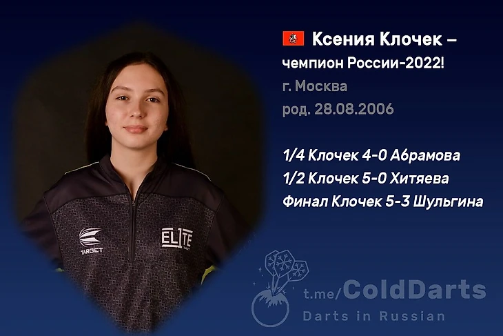А вот последний шаг не удался. На пути к титулу встала Ксения Клочек – 15-летний вундеркинд из Москвы, которая в своём возрасте играет на уровне профессионалов. В золотом матче Ксюша обыграла Елену с набором 75,06 – казалось бы, как такое возможно?! Но это не особо удивляет: девочка прогрессирует на глазах и в ближайшие годы вполне способна стать новой звездой мирового дартса. Пока же она стесняется внимания публики, но это исправимо.