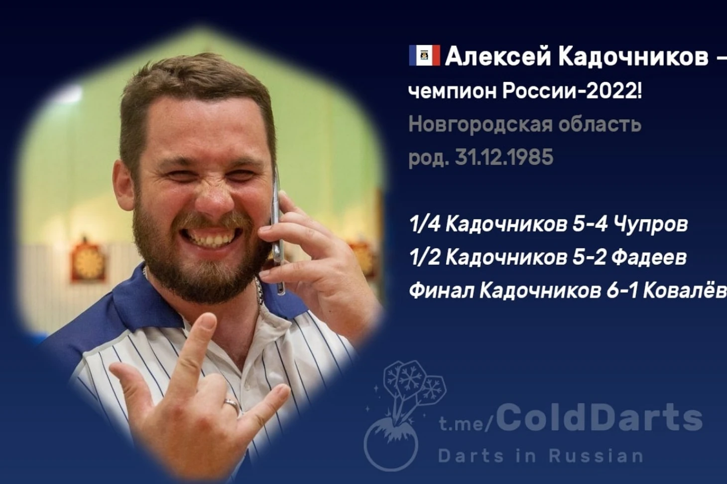 После вылета Кольцова в личке главным претендентом на титул стал Алексей Кадочников – ещё один топ, только уже из высших слоёв рейтинга World Darts Federation. В этом году он выиграл все турниры, в которых принимал участие – начиная от двух январских под эгидой WDF и заканчивая чемпионатом Северо-Западного федерального округа. Лишь внешнеполитическая обстановка не дала Кадочникову проявить себя на чемпионате мира, куда он отобрался как сеяный.