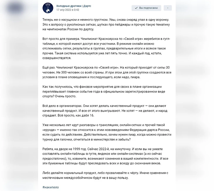 Всё это красиво, радостно и приятно. Но в большой и дружной бочке мёда затесалась маленькая капелька дёгтя, которая портит впечатление. Информации о турнире было примерно ноль: ни анонсов, ни рекламы – о нём знали только посвящённые. Все сетки составлялись вручную на бумаге (2022-й год на дворе, алё!), и чтобы достать информацию, приходилось просить игроков сфотографировать расписание. О специальных онлайн-системах или банальных гугл-таблицах в Федерации дартса России, видимо, не знают – даже список участников ЧР, каким-то чудом попавший в интернет, составлен в экселевском файле.