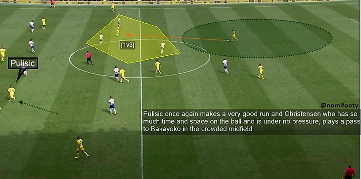 Перевод: Пулишич в 3 раз делает хороший рывок за спину защитникам, а Кристенсен, которого никто не прессингует, отдаёт передачу Бакайоко в уже перегруженную защитниками зону.