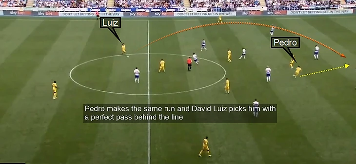 Перевод: Педро делает забегание за спину защитникам(как делал Пулишич) и Давид Луиз делает отличную передачу за спину