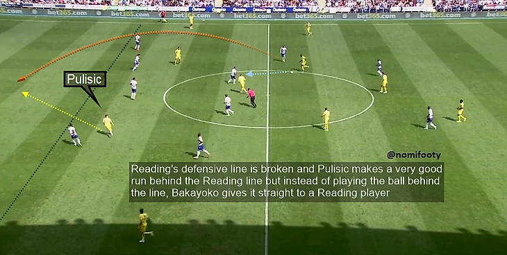 Перевод: Защитная линия Рэдинга разделена на 2 части и Пулишич совершает очень хороший рывок за спину защитникам, но вместо передачи на ход, Бакайоко просто теряет мяч.