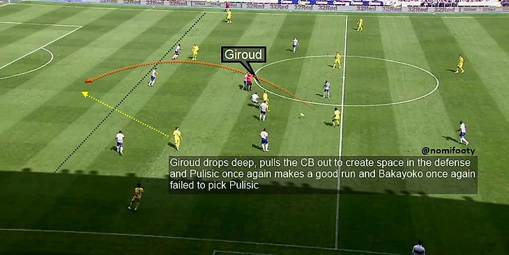Перевод: Жиру опускается к центральному кругу, вытягивая за собой защитника и создавая пространство, куда Пулишич, опять же, совершает хороший рывок, Бакайоко же в очередной раз не справляется с подобной передачей.