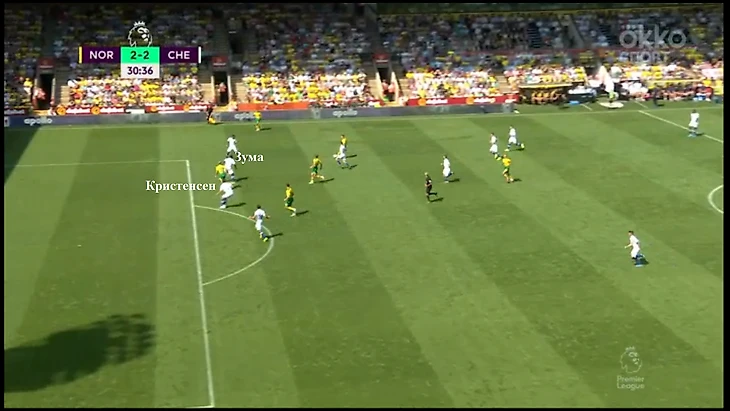 На этом я вообще хотел бы остановиться больше всего. Самый главное, что мы узнали сегодня это то, что команде нужен центральный защитник. При чём не как-то, а именно лидер. Посмотрите ещё раз на второй гол Норвича. Он произошёл просто потому, что каждый защитник делает разные вещи. Кристенсен играет по игроку, Зума по оффсайду. Оба этих защитника могут хорошо работать, когда они в паре с человеком, который им помогает. Зума играл с Терри, поэтому так хорошо выглядел. Кристенсен отлично играл третьего центрального, когда он видел всё поле. Там он может руководить. В двойке, пока что, нет.