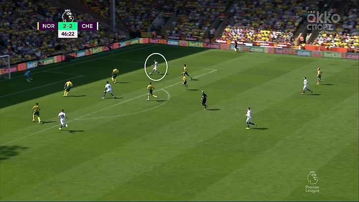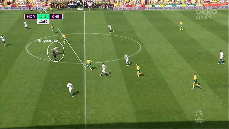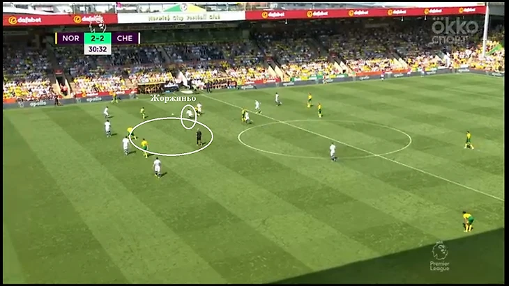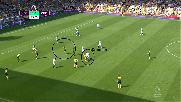 Жоржиьно проиграл единоборство и 5(!) человек из команды противника находятся между линиями Челси. Это ненормально. Отдельный привет Зума, который находится в километре от Кристенсена.