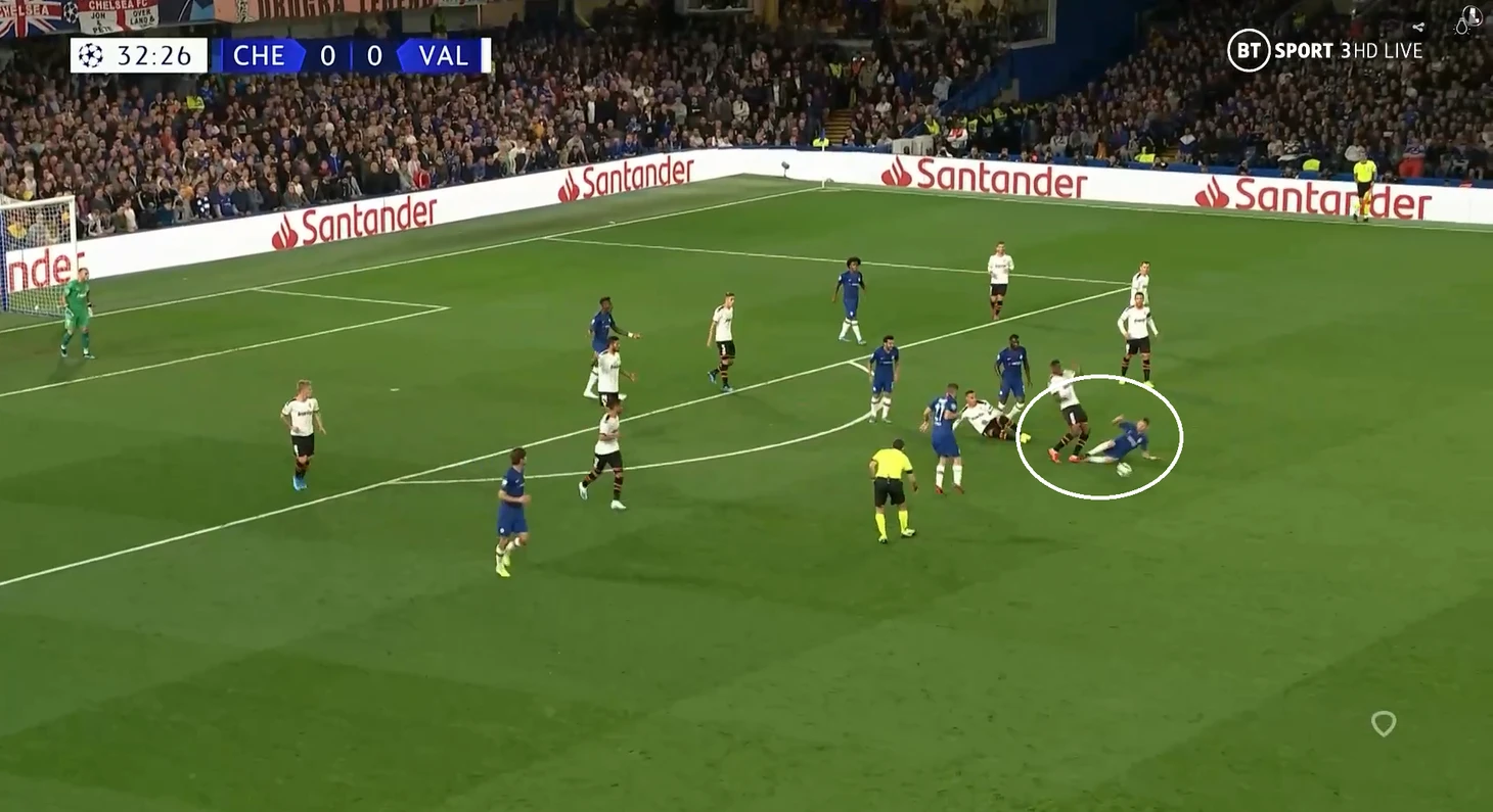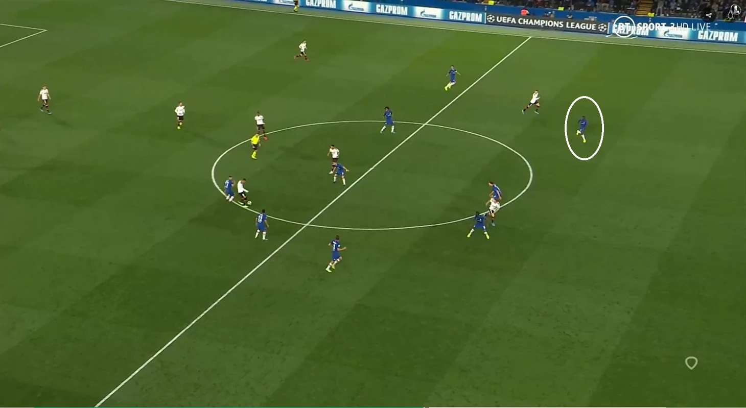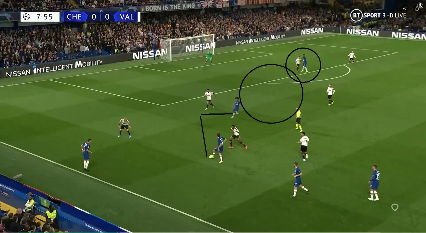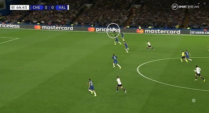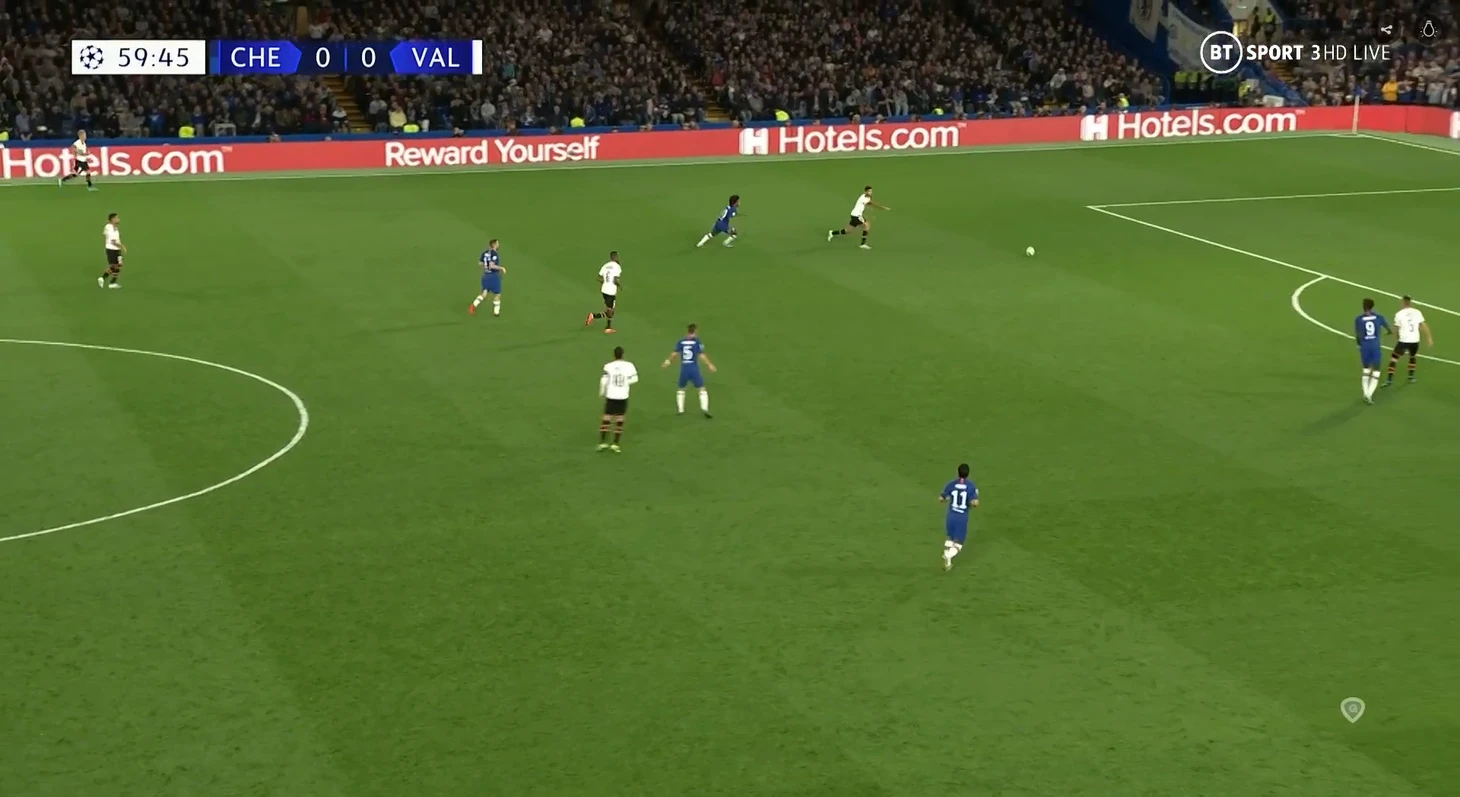 Вот ещё пример. Абрахам в этом матче двигался меньше, чем я, когда смотрел этот мяч. Виллиан делает правильное по логике действие, но Абрахам считает, что он должен стоять на месте. Все так хвалили его игру без мяча, но этот матч был полным провалом.
