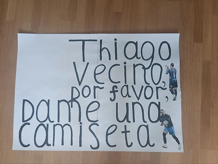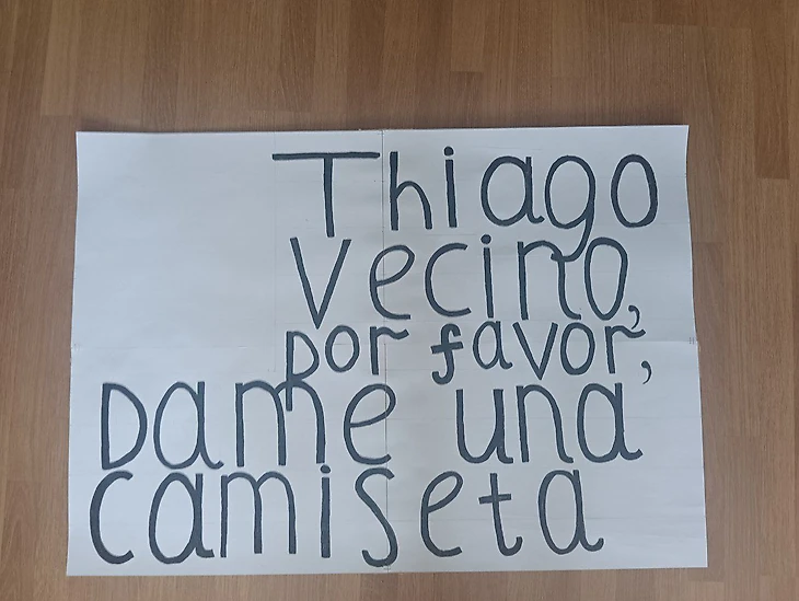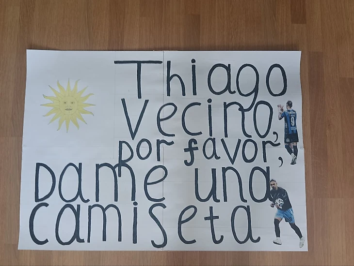 Затем наметил уругвайский флаг и написал на испанском фразу «Thiago Vecino, por favor, Dame una camiseta» (Тьяго Весино, пожалуйста, подари футболку). Кажется что все это делается очень быстро, но на буквы у меня ушло три черных маркера и два часа времени.
