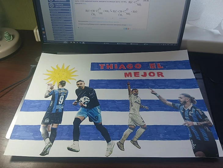 Но на первом же этапе работы с плакатом совершил огромную ошибку. Взял для плаката всего один лист А3, который никакой футболист не увидит. Тогда я этого не понял и славно постарался над оформлением. Задумка нарисовать уругвайский флаг, приклеить фотографии Весино и написать короткий текст показалась мне успешной. Получился небольшой, но выделяющийся плакат.