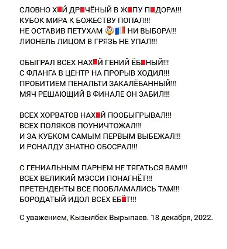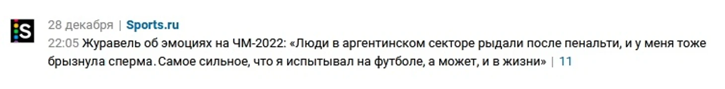 Вспомните, как «оракул-предсказатель» Губерниев никогда ничего не предсказывал. Это забавная история о том, как наслоение симуляций и навязчивое воспроизведение симулякров приводит к появлению самописных необъяснимых сюрреалистических пьесс, состоящих из ошибок и абсурда. Забавно, но в масштабах истории это порой приводит к войнам. Так и сейчас сконструированный миф об «ульра-бойцах» и «святых подонках» из Аргентиины под предводительством «скромного гения» открывает ящик пандоры для появления в футболе треш-тока и элементов рестлинга. Модное слово «токсичность» здесь как никогда к месту, потому что этот турнир отравил футбол на долгие годы вперёд через влияние чемпионов на молодёжь, которая будет подражать своим кумирам. Современный плебс в восторге принимает «хорошенько отсосите мне» от Де Пауля, и действительно хорошенько отсасывает, ведь только ради этого он и смотрит футбол. Маргинальное и провокационное поведение Эмилиано Мартинеса, бесконечные треш-токи от него, Месси, Агуэро, других аргентинцев и даже посторонних профессионалов: эту модель поведения уже подхватили те, кто недавно был просто экспертом и спокойно говорил об игре (см. токсичный комментарий Антонио Кассано о вселенском величии Месси). Медиа сегодня во имя детей делает нормой назвать соперника «членоголовым» на аудиторию в полмиллиона человек. И это тоже будет хорошо продаваться под соусом «безумных страстей» и чего-то искреннего. И это прямо сейчас, в данный момент становится не просто нормой, а эталоном для новых поколений. Никакой трагедии из этого делать, конечно же, не стоит. Так в футболе реализуются элементы успешной бизнес-модели UFC. Это станет частью игры в будущем.