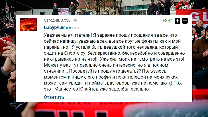 «Я устала быть девушкой человека, который бесперебойно сидит на Спортс.ру». Подруга пользователя Sports.ru в отчаянии