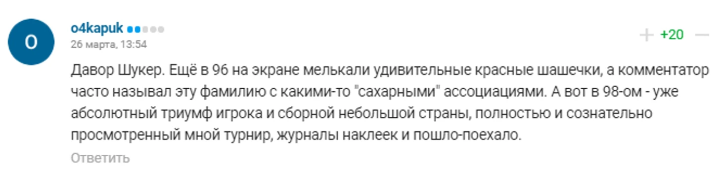 На этой неделе авторы Sports.ru рассказывали об игроках, благодаря которым в детстве полюбили футбол. Под этим прекрасным ностальжи-постом вы написали почти 800 комментариев – невероятно! Ниже мы собрали лучшие истории.