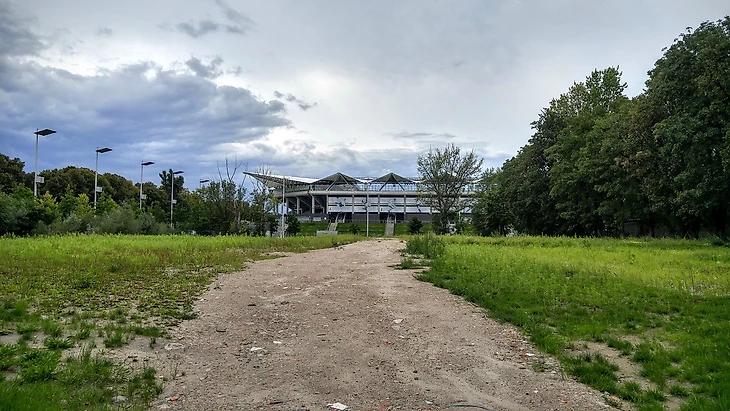 У шоссе вблизи стадиона есть большое неосвоенное пространство, которое можно использовать под парковку. Но пока что оно используется чуть более, чем никак.